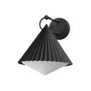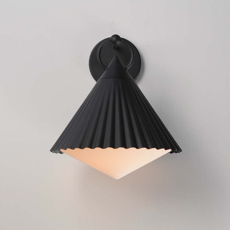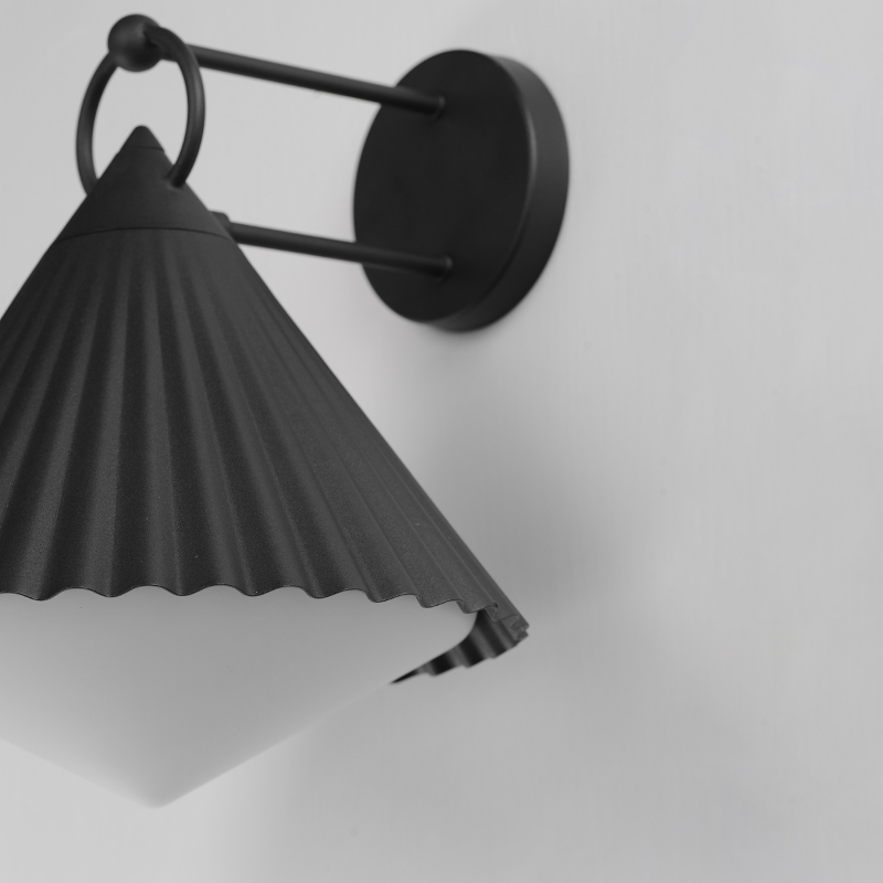Adding charm to the outdoors, the Odette series features a scalloped pyramid shade suspended from a ring of Die Cast Aluminum. Supported within the shade is an inverse pyramid that peaks out beneath the hem of the aluminum shade marrying the two pyramid forms. Graceful and playful, these outdoor sconces add the designer touch to both indoor and outdoor locations.