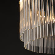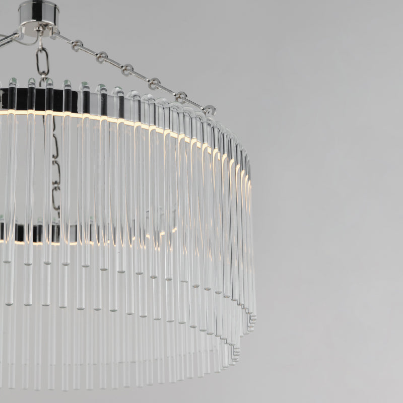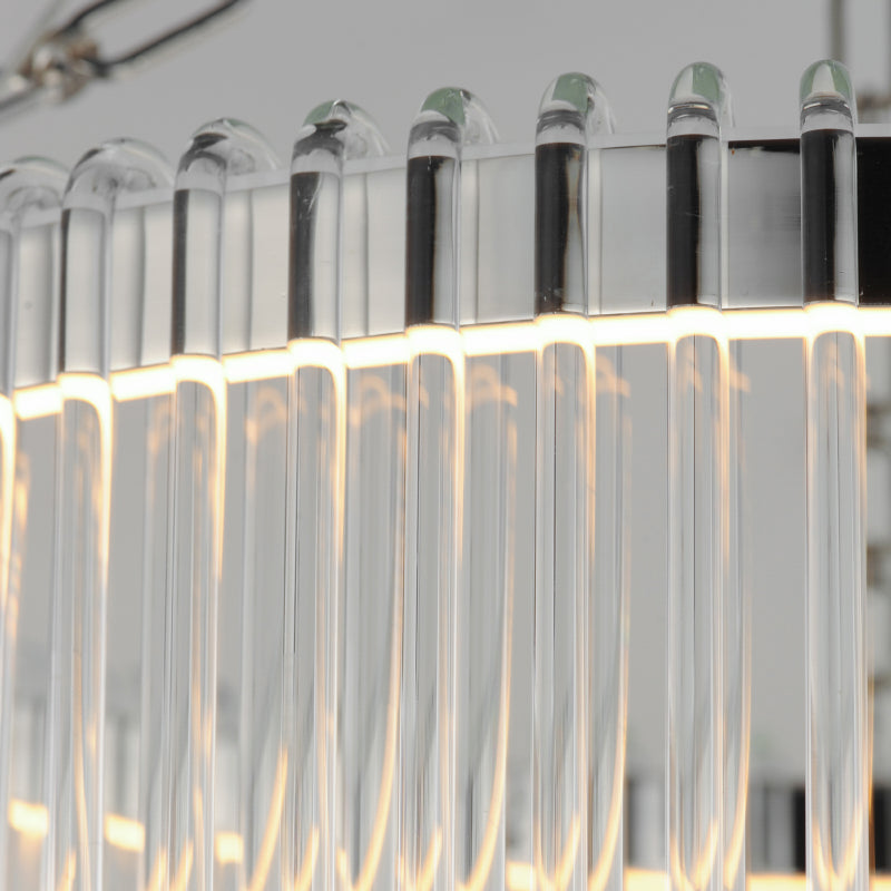 Clear glass rods elegantly curve to drape over a metal frame, encasing an integrated LED light source within. These ornamental glass rods form a luminous curtain, softly illuminated by the LEDs.