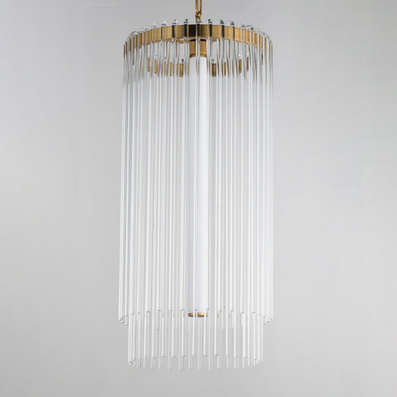 Clear glass rods elegantly curve to drape over a metal frame, encasing an integrated LED light source within. These ornamental glass rods form a luminous curtain, softly illuminated by the LEDs.
