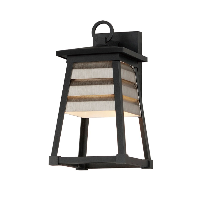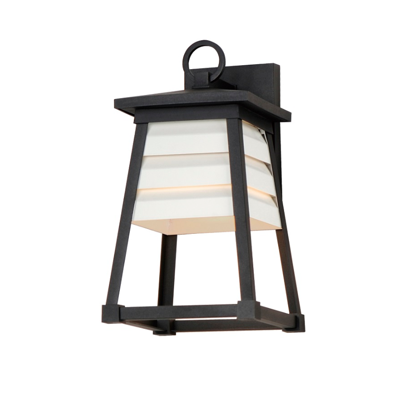 Contrasting louvered insets are set within Matte Black trapezoidal frames. The frames are made of Vivex so their finish will withstand harsher climates. The louvered panel insets are made of aluminum and feature a full cut-off design aesthetic making this design suitable for Dark Sky applications. An added benefit is the removal of glass altogether, adding a robust quality to the construction of the fixtures leading to longevity and lower maintenance.