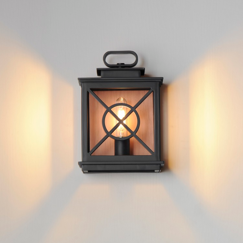 Styled as a classic early American coach lantern, the Yorktown sconces offer an established exterior design aesthetic with the modern engineering to withstand the harshest climates. A crossing pattern of the material wraps clear glass panes that protects them and adds visual interest. Featured prominently on the back plate of these lanterns is a stainless-steel overlay in Antique Copper that evokes the historical reference embodied in the design and attractive contrast to the fixtures rated for wet locations.