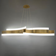 A sleek and sophisticated chandelier for contemporary and transitional spaces. Concave and convex arcs are mirrored above and below. A statement piece for over a dining or conference table.