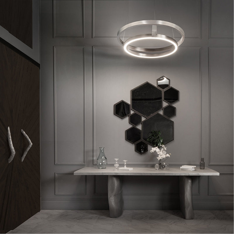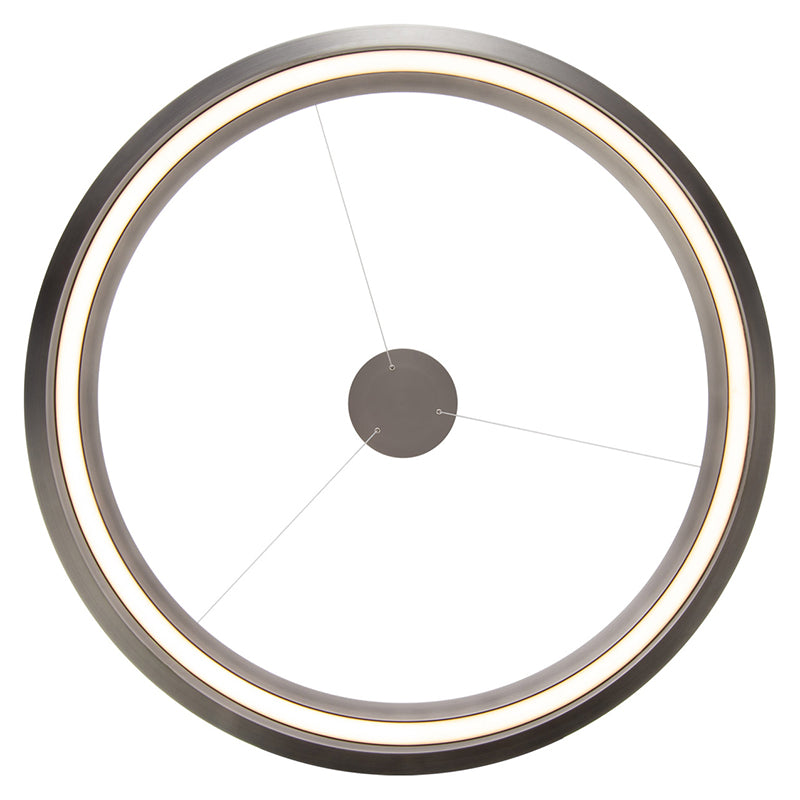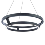An architecturally scaled, two tiered pendant offering both pward and downward illumination from energy efficient LEDs.