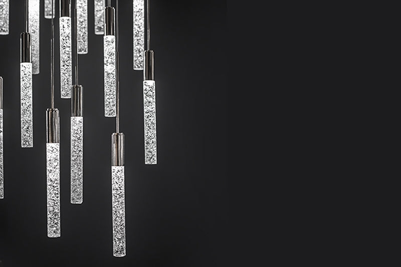 Crafted from Piastra crystal, an artisanal technique that dates all the way back to the 13th century, these crystalline staves project gorgeous LED illumination from all sides for a dazzling presentation of light. Whether you choose a simple pendant or design an entire space with coordinating chandeliers and sconces, these sparkling designs will make you believe in Magic.