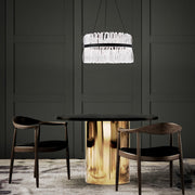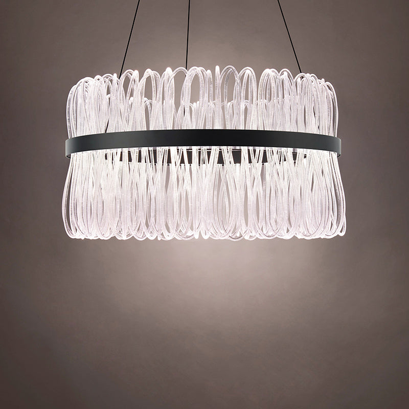 Innovative fiber optic strands carry light for an even up and downward glow. A brilliant ring rounds out this impressive, uniquely crafted luminaire. Delicate contoured lines bathe you with inviting illumination.