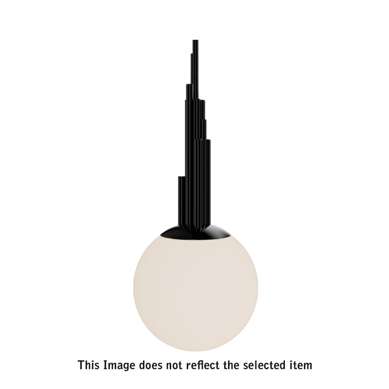 Showcasing Art Deco elegance with its layered cantilevered bars, the graceful Sybil pendant exudes a sleek, modern aesthetic. A minimalist round globe shade illuminated by color temperature selectable LEDs enhances the sense of order and balance, emerging gracefully from the pendant's clean, structured lines.