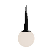 Showcasing Art Deco elegance with its layered cantilevered bars, the graceful Sybil pendant exudes a sleek, modern aesthetic. A minimalist round globe shade illuminated by color temperature selectable LEDs enhances the sense of order and balance, emerging gracefully from the pendant's clean, structured lines.