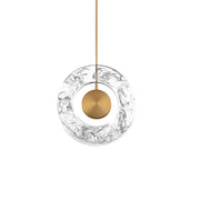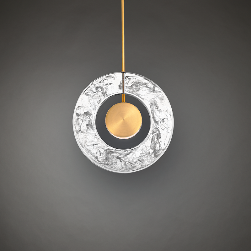 Resonating like a vibrant note stands this elegant halo of light. The heart of this creation enticingly illuminates a ring of cloudy skies. Holistic beauty is accentuated with an aged brass architectural finish.
