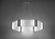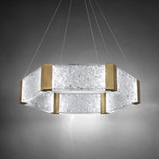 Spectacularly luminous panels made with reclaimed K5 crystal are spellbinding in this exquisite chandelier. Clandestine LED light sources are powered by thin cables that suspend the frame to the canopy for a technologically advanced design with the utmost attention to detail.