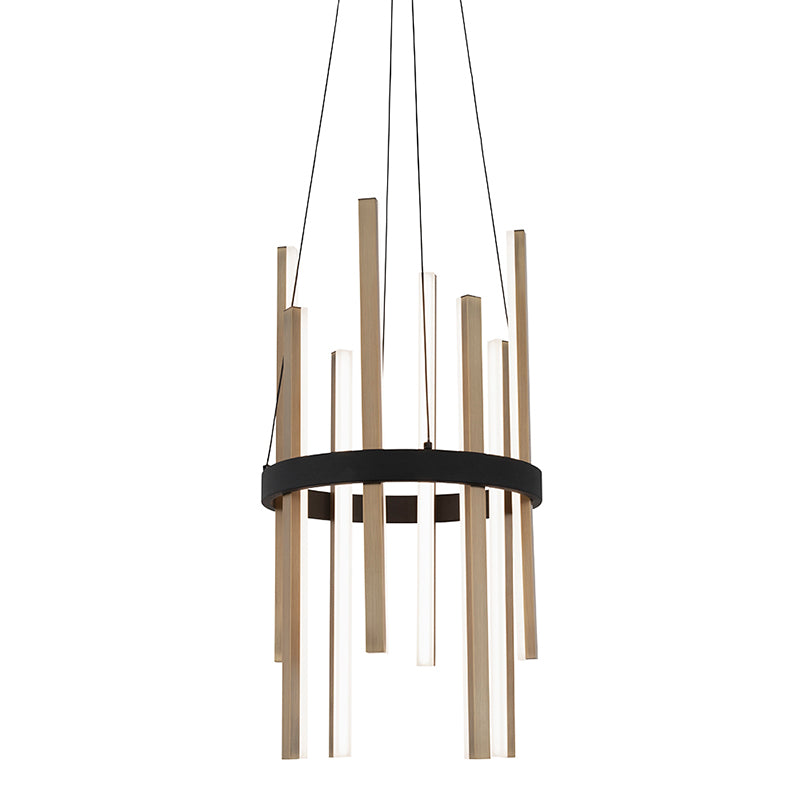 Like a dynamic instrument of musical chimes. Harmonix plays to the rhythm of light. Beautiful playful light. A two tone finish features black with aged brass.