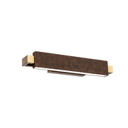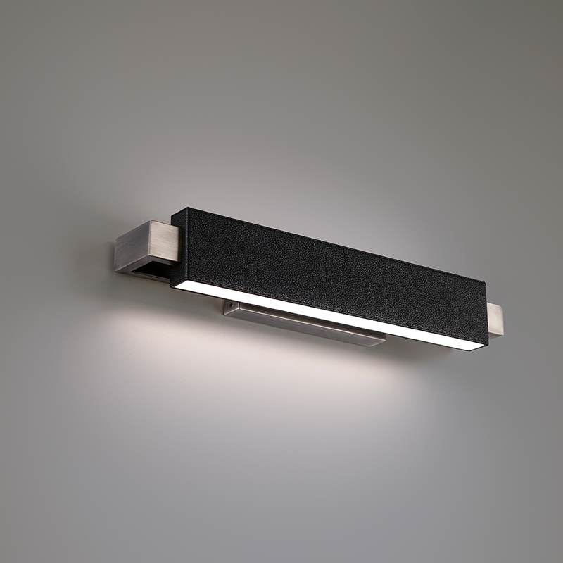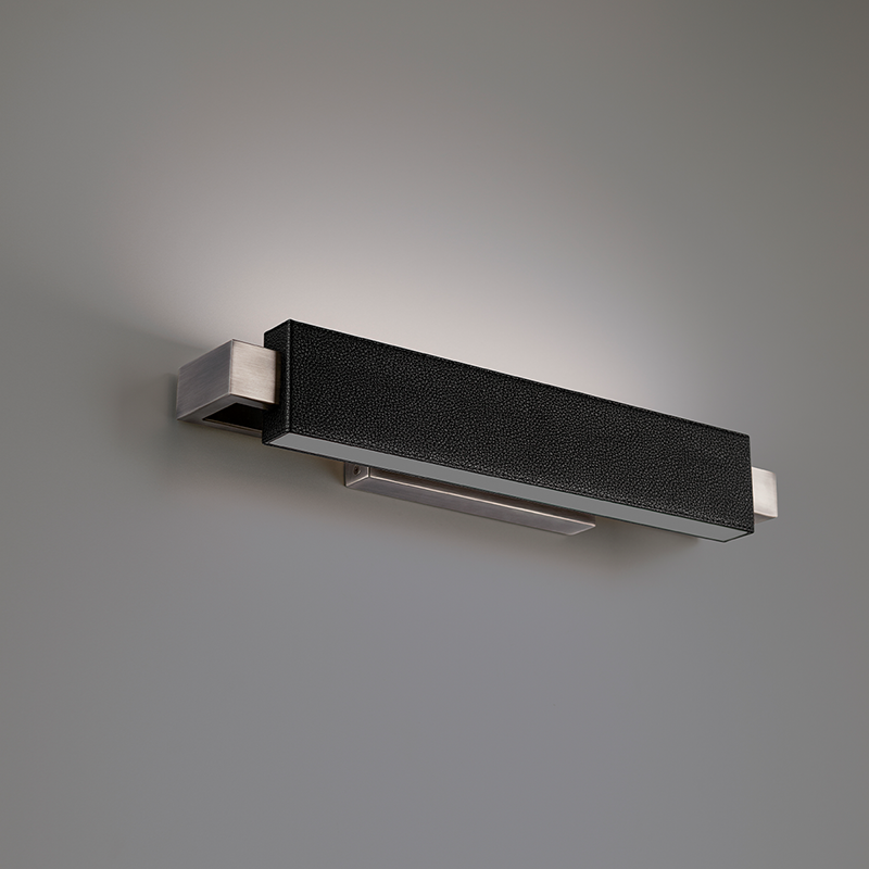 Illuminating couture for interiors. Elegant contrasting pebbled black leather and brushed nickel or combinations of warm brown leather and aged brass exude fashion runway references. This handsome luminaire adds upward and/or downward illumination. Perfect in a formal powder room or mounted over built-in library shelves in a study, this versatile light orients both vertically and horizontally.