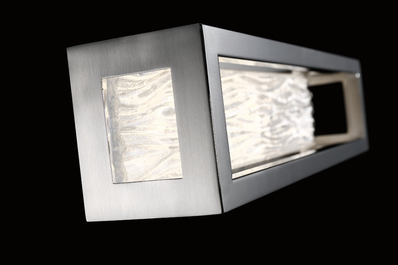 A dramatic fluid design. The rhythm of rippling oceanic waves is captured within the cased glass lens floating inside the frame. Integral LEDs backlight the glass for a stunning luminous effect, like reflections of moonlight on waves.