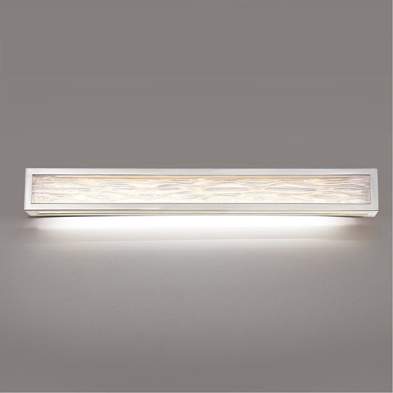 A dramatic fluid design. The rhythm of rippling oceanic waves is captured within the cased glass lens floating inside the frame. Integral LEDs backlight the glass for a stunning luminous effect, like reflections of moonlight on waves.