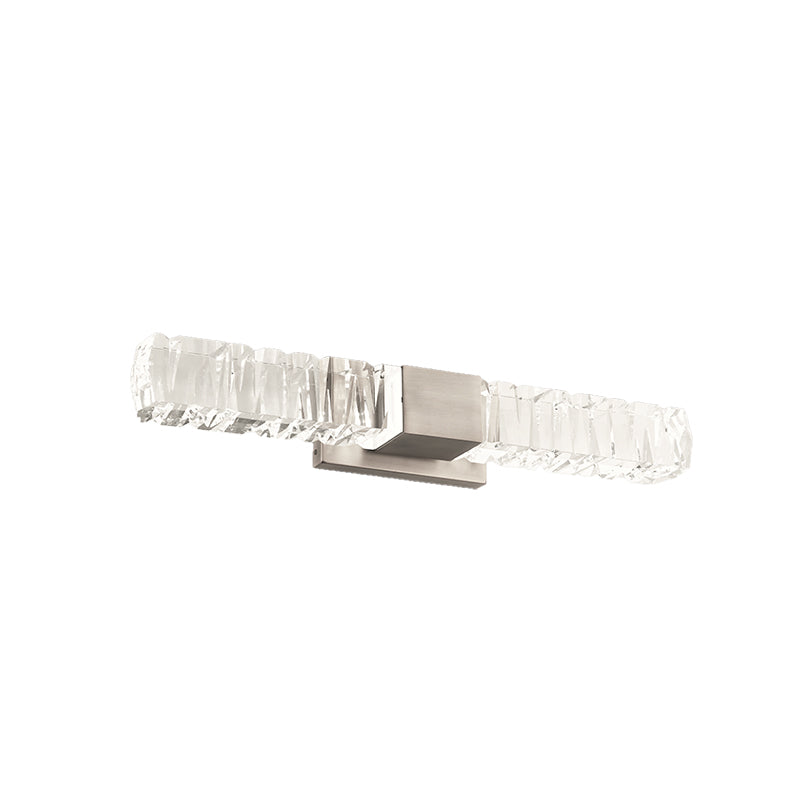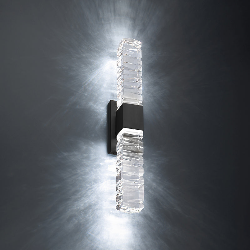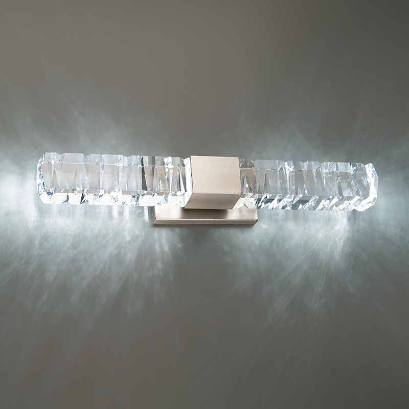 A chiseled luminaire with a captivating sculptured texture. This design features solid faceted crystal spears dramatically carved for a prismatic impact. A luxury design engineered for enduring beauty and longevity.