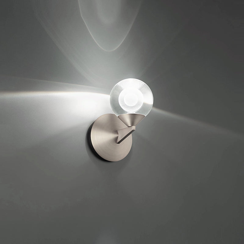 Sleek, minimal, abstract. Designed like a larger orb possessing a smaller sphere, elegant luminosity is diffused through a laser etched crystal ball.
