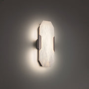Add a dose of luxury from the rich and varied look of carved alabaster. Simply held by two metal accents. Diffused illumination glows from the stone creating an elegant, refined aesthetic.