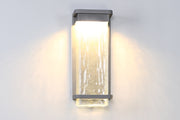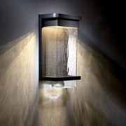 Raindrops falling gently on the window pane. This stunning effect is the result of concealed LEDs illuminating from above while casting a warm beam through clear hammered seeded, mouth-blown optic glass. The durable body and minimalist design compliment a multiplicity of architectural styles. Perfect for indoor and outdoor settings in luxury homes and resorts.