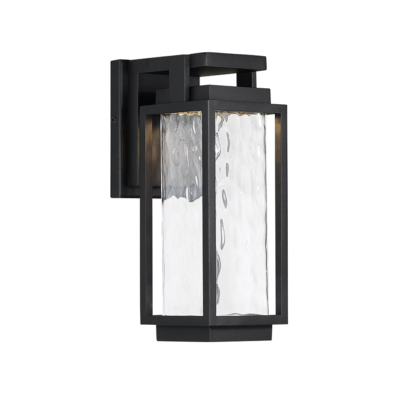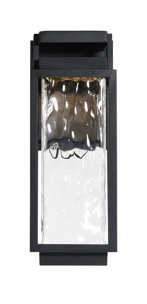 Take shelter from the storm. Like a hard rainfall on the window panes, timeless inspiration is melded with modern technology to create a stunning LED luminaire. Beautiful light diffuses through clear hammered mouth blown glass for a soft glow on all sides of this geometric wall sconce. Crafted from extruded aluminum and wet rated for outdoor use, this piece is guaranteed to make a grand first impression.