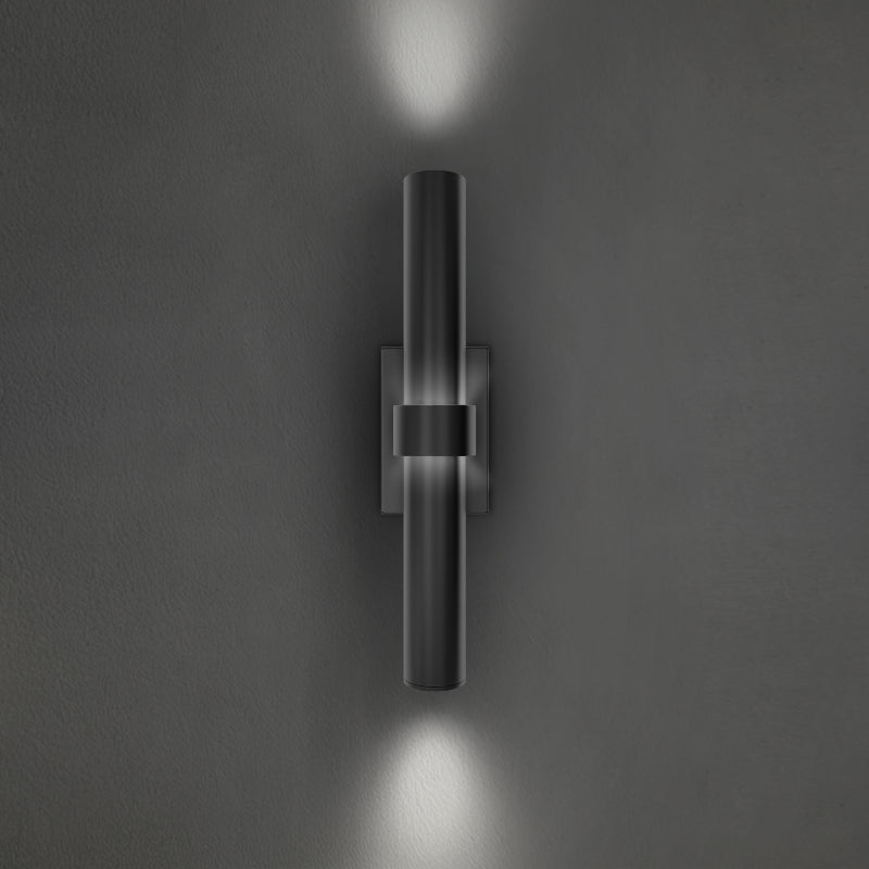 Tall and slim, the Quincy outdoor wall light boasts a low-profile metal mount that holds a large vertically-mounted cylinder. The double lamping at its center delivers a seamless flow of up and " down, color temperature adjustable LED light through each open end.