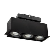 Trimless multiple lighting system allows each lighting module to be independently adjusted on 2 axis and is available in dedicated LED or PAR30 medium base. The Trimless MLS installs in a hard ceiling in remodel and/or new construction applications, and is available in 1 to 3 light linear configurations. The included mud plate frames the housing with clean sharp edges leaving a smooth flange-less appearance that blends in with the ceiling line.