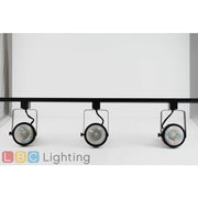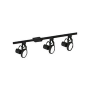 3-Light Line Voltage track kit, in Black finish with Gimbal Ring track heads.
