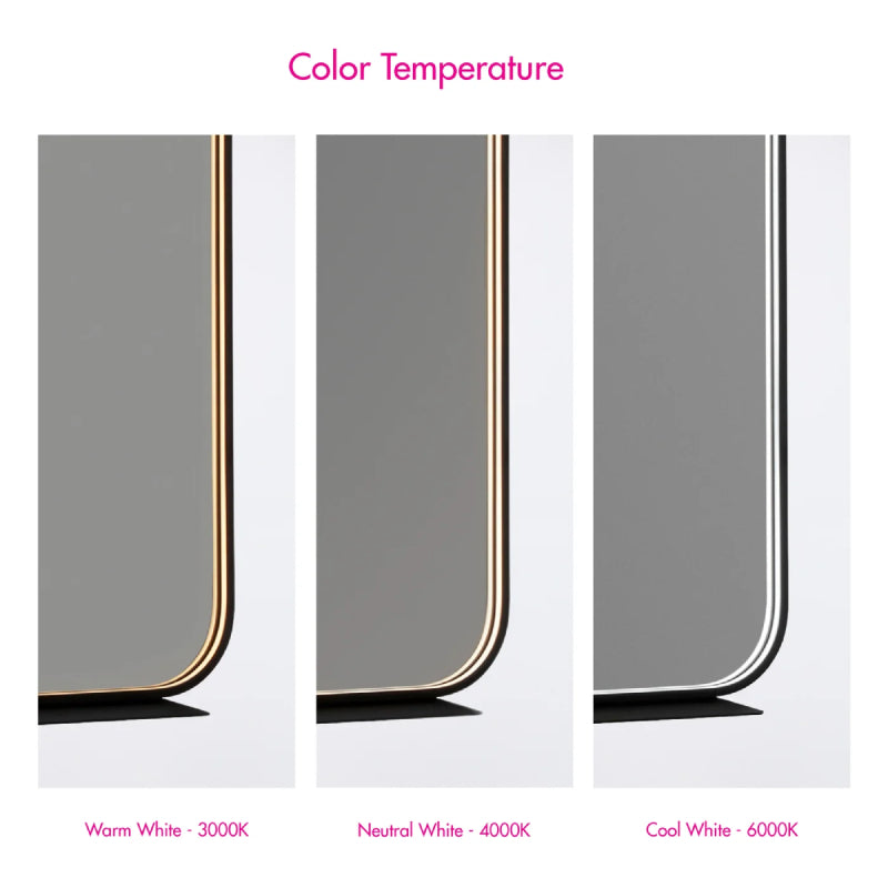 - Seamless aluminum matte black frame with integrated LED indirect lighting. The light source is completely concealed when switched off