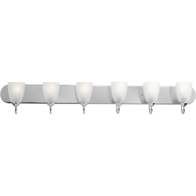 Gather possesses a smart simplicity to complement today's home. This six-light bath bracket contains etched glass shades which add distinction and provide pleasing illumination to your room.
