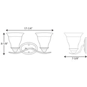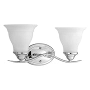 Two-light bath fixture featuring soft angles, curving lines and etched glass shades that mount up or down. Gracefully exotic, the Trinity Collection offers classic sophistication for transitional interiors. Sculptural forms of metal and glass are enhanced by a classic finish. This transitional style can transform a room or your whole home with its charming versatility.