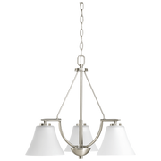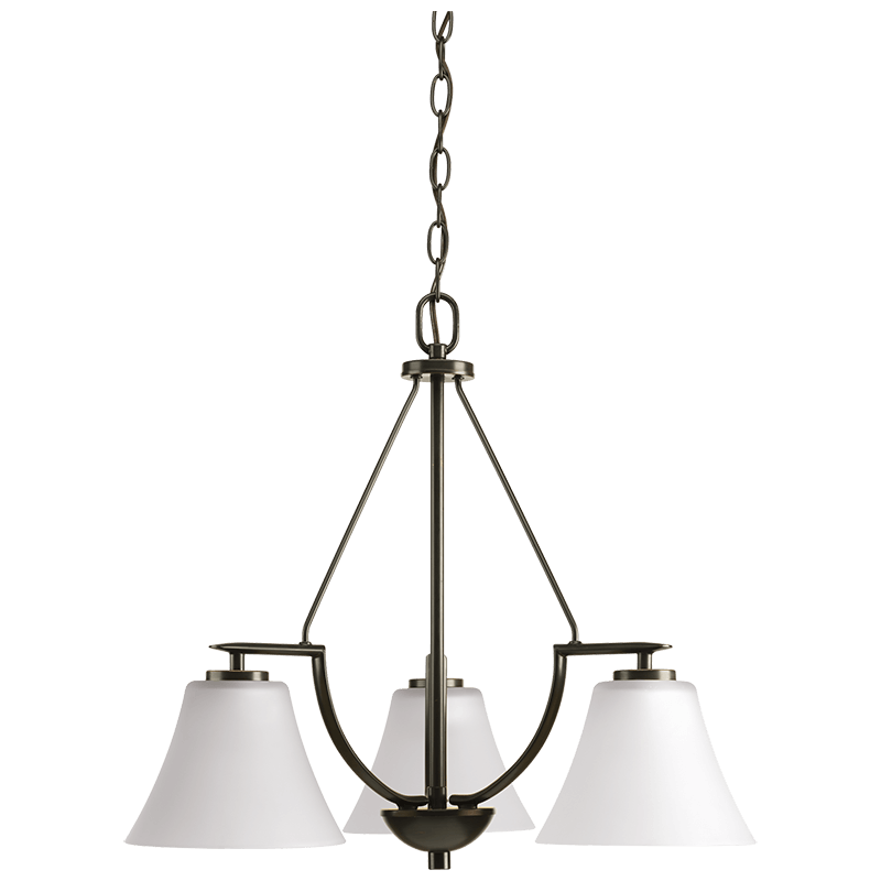 Three-light chandelier with etched glass from the Bravo collection. Linear elements stream throughout the fixture to compose a relaxed but exotic ambiance.
