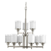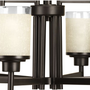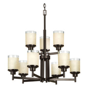 Nine-light, 2-tier chandelier features a pleasingly simple Antique Bronze frame while visually interesting textured etched umber linen glass are complemented by a crisp, clear edge accent. Create the sophisticated feel of modern, urban living in your home - no matter where you live.
