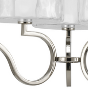 Three-light chandelier. Caress features a chic, sophisticated three-light chandelier featuring a Polished Nickel metal frame with layered glass diffusers to cast a glimmering light. An outer shade of clear, water glass adds rich texture and playful reflections from a central etched glass diffuser.