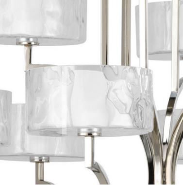 Nine-light, two tier chandelier. Caress features a chic, sophisticated nine-light, two-tier chandelier featuring a Polished Nickel metal frame with layered glass diffusers to cast a glimmering light. An outer shade of clear, water glass adds rich texture and playful reflections from a central etched glass diffuser.