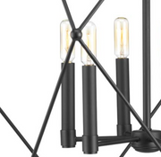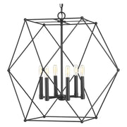 Spatial showcases a modern form that complements Urban Industrial and Bohemian styles. Overscaled geometric frames feature designs inspired by metal trusses and the art of engineering. A Matte Black finish is highlighted by clear globe shades or open candles.