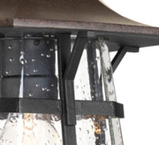One-light hanging lantern from the Derby collection boasts a combination of Espresso and textured black powder coated finishes. The seeded glass diffuser is encased in the cast aluminum black from with the Espresso finish on the roof.