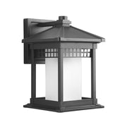 Square etched glass shade within rectilinear frame which showcases pierced grid pattern. One-light medium wall lantern in a durable powder coat finish.