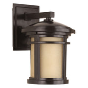 Small wall lantern with etched or umber linen glass. Includes dark sky shield for full cut-off illumination or remove for a traditional lighting effect.