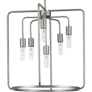 The Bonn Collection Six-Light Galvanized Pendant personifies an industrial vintage vibe sure to create an unforgettable lighting experience. From the bottom of the sleek center stem, light bases appear to gracefully drip down and give an extra touch of refined visual interest with their varying lengths.