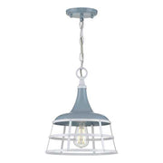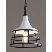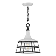 A country basket shade is coated in a black farmhouse-inspired finish. A metal covering coated in a crisp white finish contrasts with the black basket shade as it holds the light source in place.