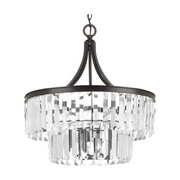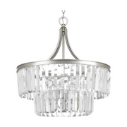 Glimmer fits the definition of livable luxury with elements that sparkle to create an instant statement within the home. Prismatic glass five-light pendants are supported by an architecturally- styled frame in Silver Ridge finish. The cascade of faceted linear glass deliver a sleek silhouette to any room.