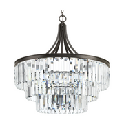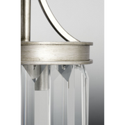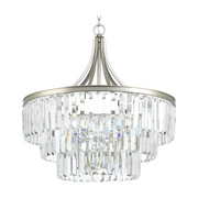 Glimmer fits the definition of livable luxury with elements that sparkle to create an instant statement within the home. Prismatic glass six-light round pendant is supported by an architecturally- styled frame in Silver Ridge finish. The cascade of faceted linear glass deliver a sleek silhouette to any room.