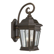 Two-light wall lantern with clear beveled glass panels and scroll arm details.