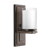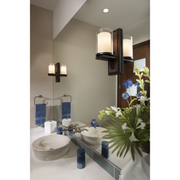 Mast has a zen-like modernism that blends the warmth of a faux-finish wooden backplate with a clean, modern pediment supporting a double-glass diffuser. The combination of clear and etched glass recreates the appearance of a votive candleholder to enhance the calming influence of this distinctive style.