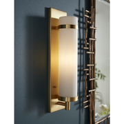 Ease yourself into a state of complete bliss and relaxation under the luxurious glow of this wall sconce. A stunning, cylinder-shaped etched opal glass diffuser held in place by a thin metal bar recalls visions of elegant candlesticks. The diffuser sits on top of a pedestal-like light base attached to a beautiful brushed nickel backplate.