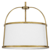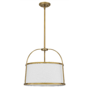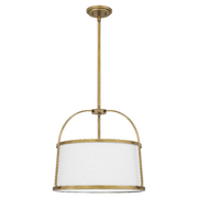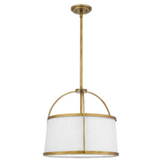 York is an enchanting take on the classic drum shade. This elegant iteration, available as a pendant, features a weathered brass finish. A light beige fabric shade adds in a subtle, tasteful texture.