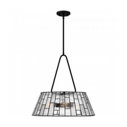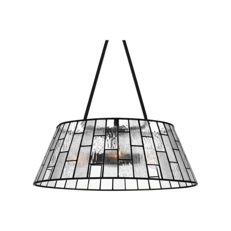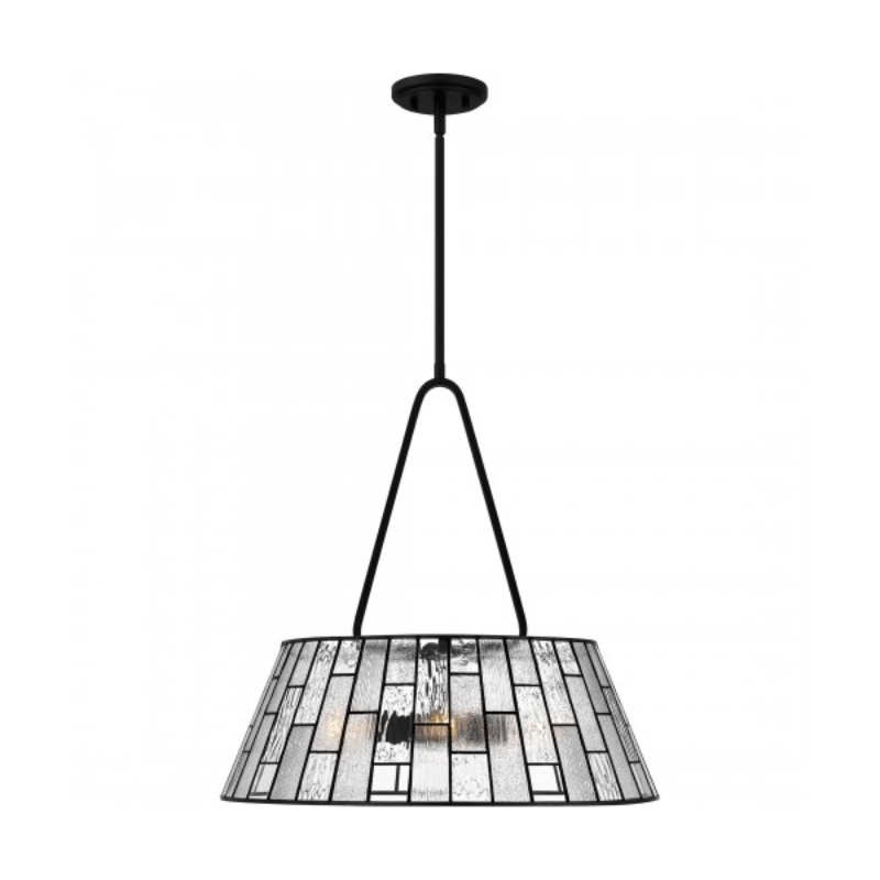 Rainier's traditional design adds simple sophistication to any space. A matte black finish enhances the drum shade silhouette, complemented by multitextured art glass panels. Hang the Rainier pendant by itself or in a grouping over a kitchen island, bar area, or over a table for instant, classic style.