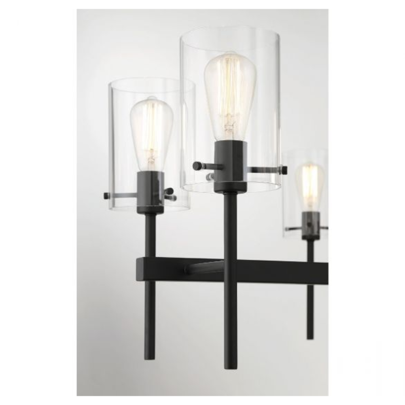 Spanning five feet in width, the Savoy House Vista chandelier makes a grand statement for grand rooms. Sixteen lights inside clear glass shades are arranged on two crisscrossing arms finished in matte black. Vista has an adjustable height ranging from 15.5" to 69.5" and is 60" wide. It uses sixteen standard size bulbs of up to 60 watts per bulb. Comes with eight 12" downrods and two 6" downrods, plus 80" of cord.