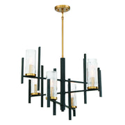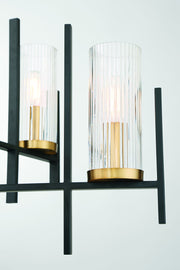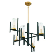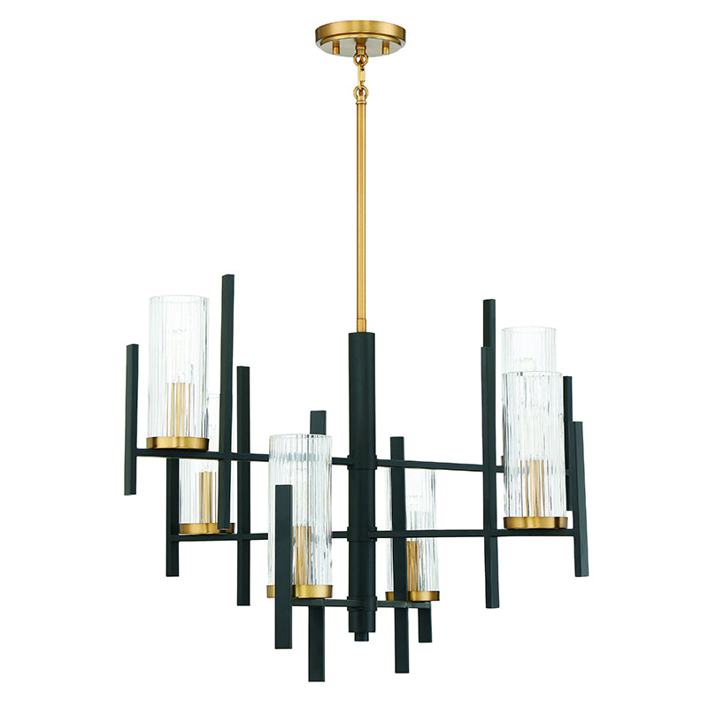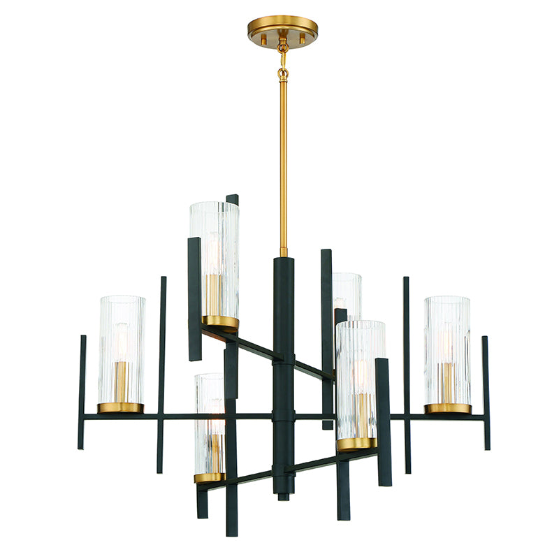 Bring in the midcentury modern inspired look of the Savoy House Midland 6-light chandelier. Tall shades of clear ribbed glass sit within a sharp, intriguing frame finished in the beautiful pairing of matte black and warm brass.