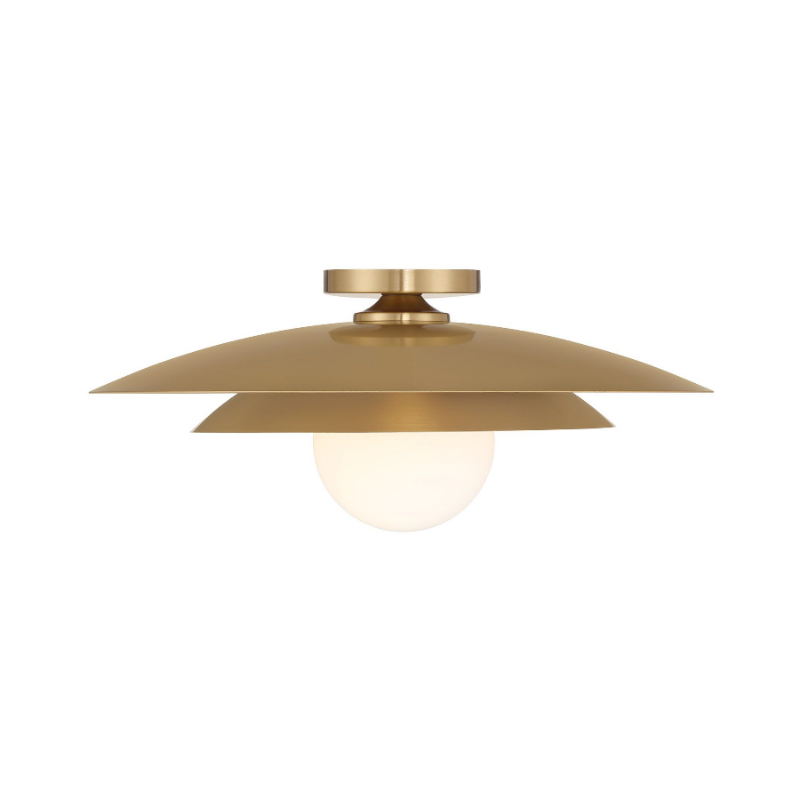 The Savoy House Sherrer 1-light ceiling semi-flush mount allows you to bring an icon of midcentury modern style into any room! It showcases a louvered shade that concentrates and directs the light coming from the white opal glass globe. The Warm Brass finish creates a bright and beautiful glow.