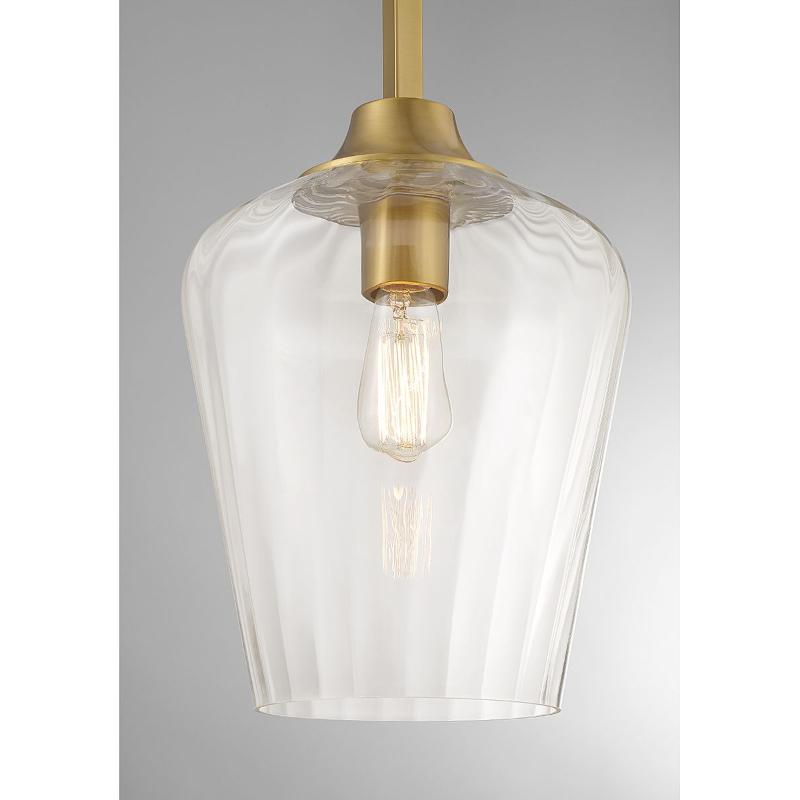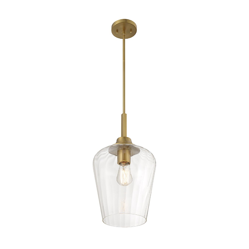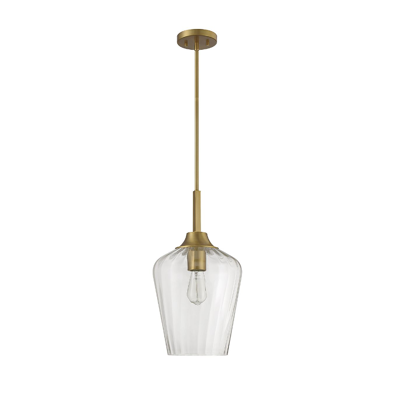 The Savoy House Carlton 1-light pendant features a beautifully streamlined style highlighted by a shade of ribbed glass that gives a hint of motion. Finished in warm brass.