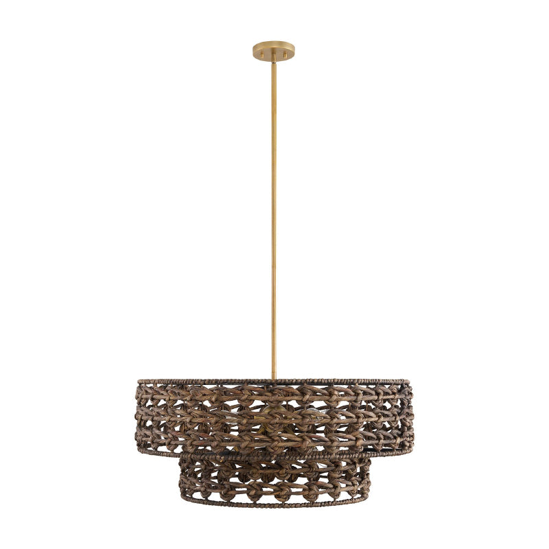 The shades are crafted from intricately knotted natural water hyacinth, a sustainable organic material that catches the eye and creates effortless serenity.